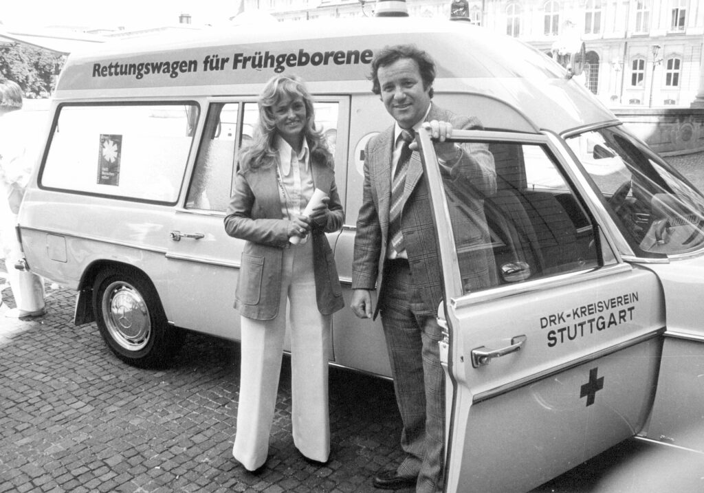 Ute und Siegried Steiger vor dem ersten Baby-Notarztwagen.